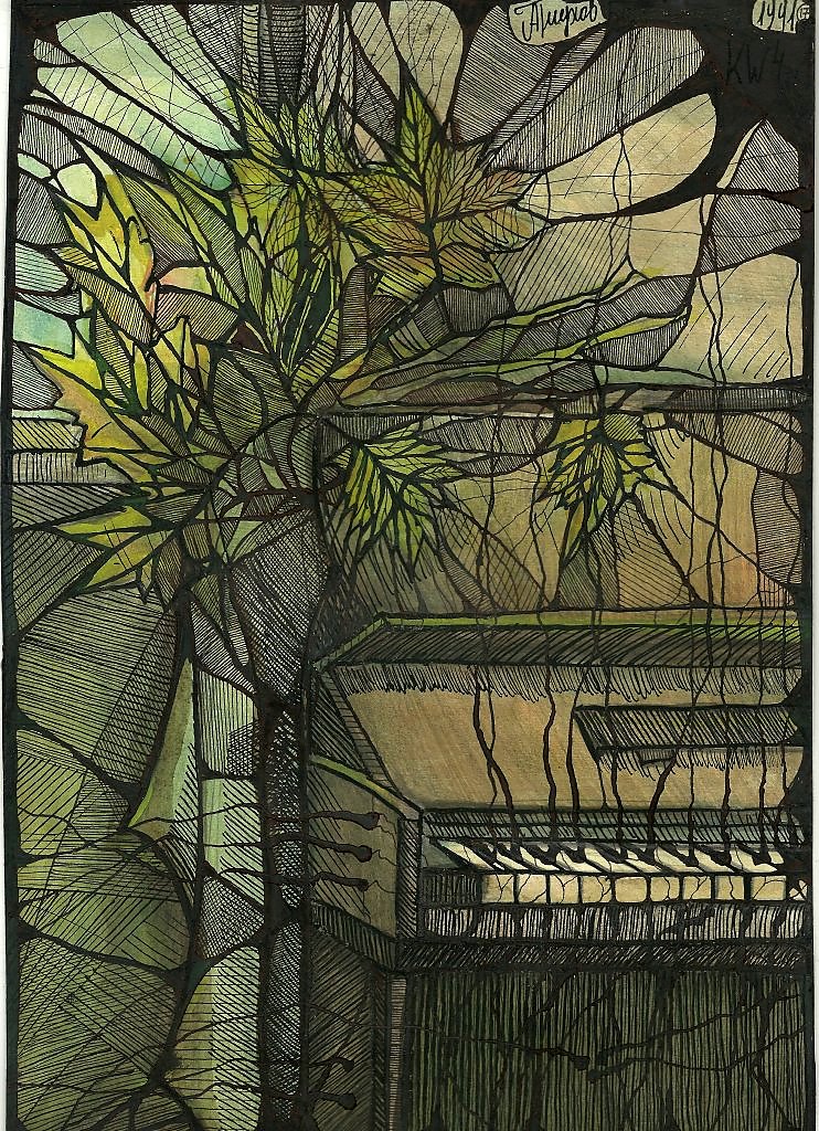 А. Глухов. Композиция с пианино II. 1991. Бумага, акварель, чернила. 30Х21. Коллекция Благодатова Н. И.