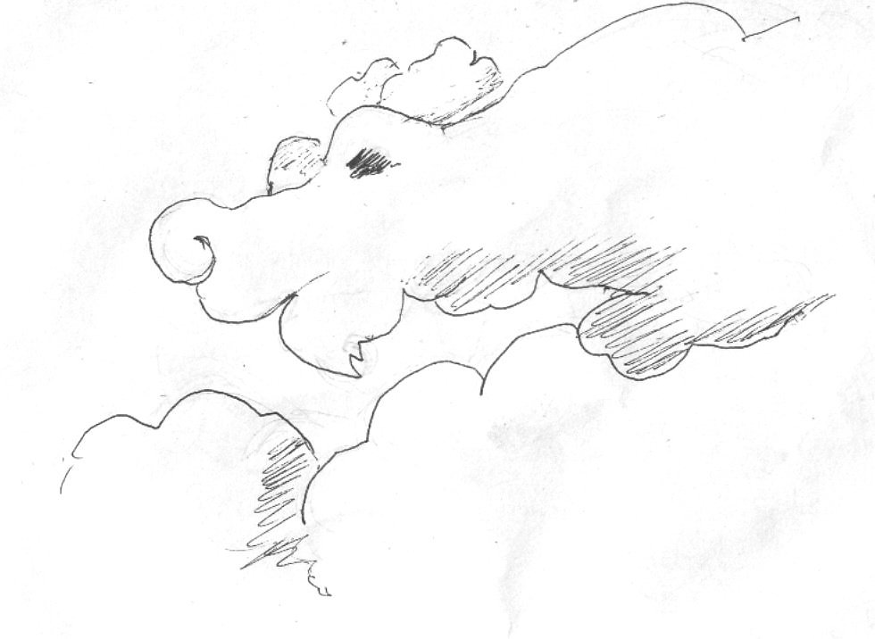 Позавчера наблюдал за облаками и увидел замечательные картины. Был сильный ветер, и поэтому успел зарисовать только контуры. Страшно пожалел, что не было с собой фотоаппарата, так как мои зарисовки, лишь бледное подобие картин, появлявшихся на небе.