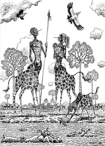 Среди кентавров тоже есть рассы. Например африканская расса негрожирафов.34*24 см. тушь, перо, 1998 г.