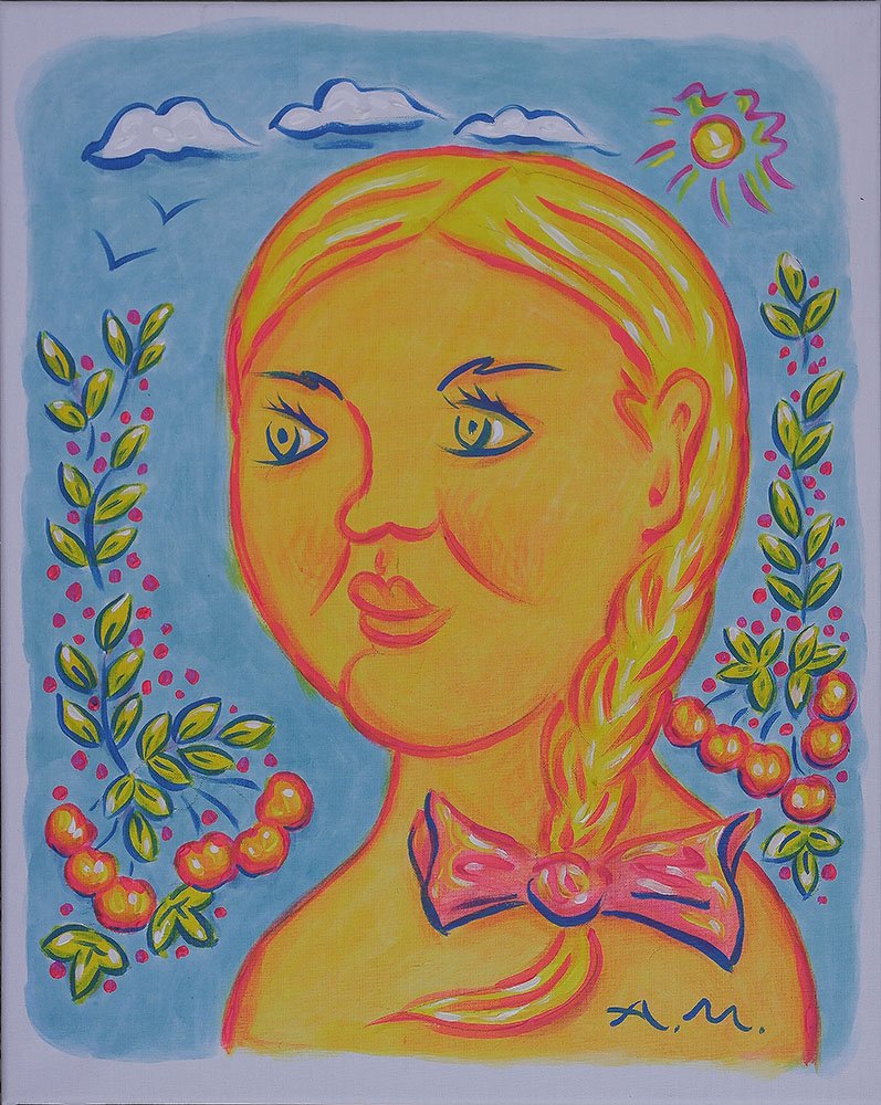 Незамысловатая работа. Женская головка. По-моему достаточно жизнерадостно. Стиль наив предполагает незатейливый сюжет, беглый рисунок, яркий колорит. Что еще зрителю нужно для счастья?