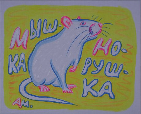 Незамысловатая работа. Белая, симпатичная мышка. По-моему достаточно жизнерадостно. Стиль наив предполагает незатейливый сюжет, беглый рисунок, яркий колорит. Что еще зрителю нужно для счастья?