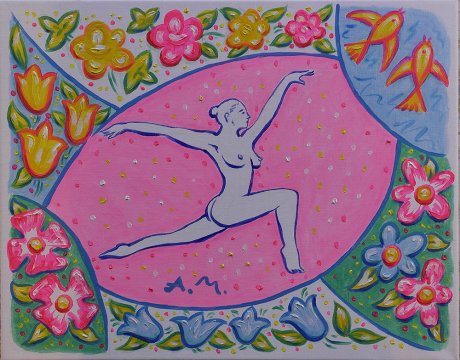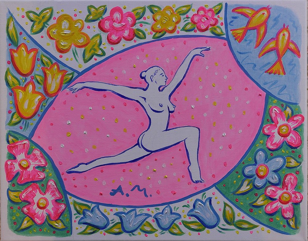 Незамысловатый сюжет - обнаженная девушка в танцевальной позе в красочном "гарнире" из цветов и птичек.