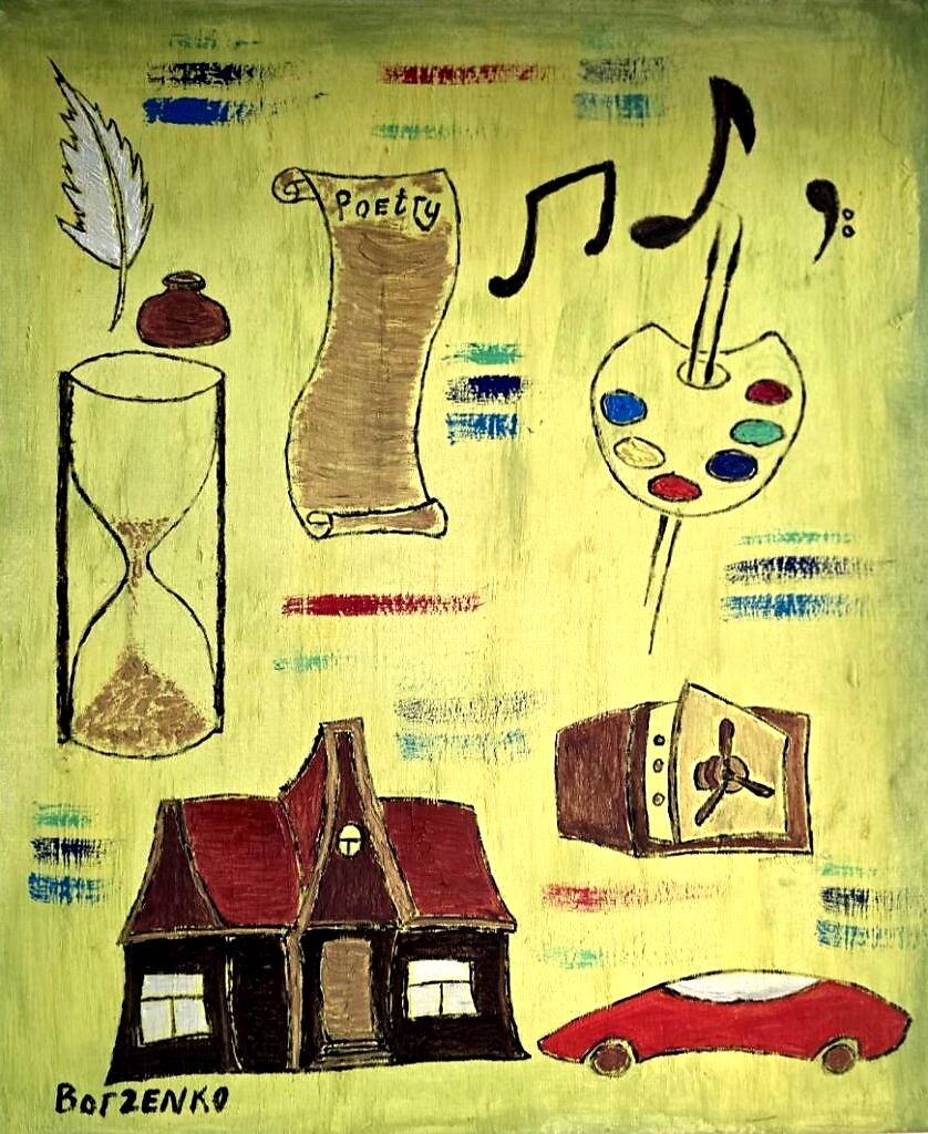 Для кого-то в жизни главным смыслом становится накопление богатства, материальных ценностей, а кто-то думает о духовном. Для иных упоение и наслаждение приносит искусство, музыка, поэзия живопись. Каждый посвящает свою жизнь своим идеалам. Это и отображено на полотне.