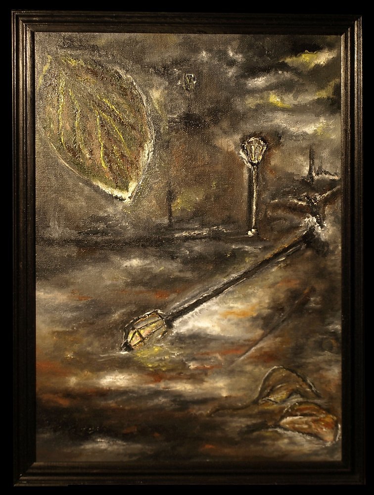 Похоже, что события идут поздним осенним вечером в моём родном городе Санкт-Петербурге. У нас в городе наблюдаешь картину, что фонарный столб упавшим лежит. Великолепный жанр !