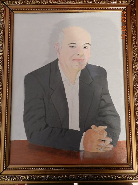 Изображаемый сидит за столом, сцепив пальцы рук и думает о чём-то своём.