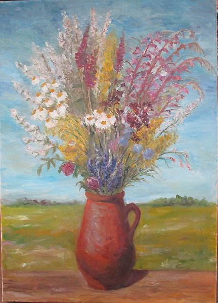 Красивая работа, вижу Иван чай, ромашки и разнотравье в кувшине. Очень тёплая и светлая картина.