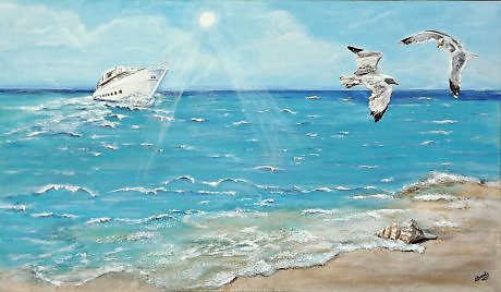 картина 1м Х 0,7м акрил , с элементами барельефа (яхта , чайки и ракушка )