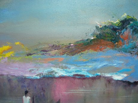 масло,оргалит,кисть,мастин.юноша,случайно попав на чудный остров ,ждет,что вот-вот появвится его единственная и неповторимая.30х40.2016