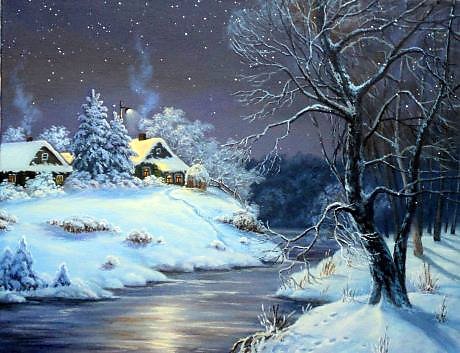 РАБОТА ИЗ СЕРИИ "СНЫ ИЗ ДЕТСТВА", РАЗМЕР 40 - 50 СМ., Х/М., 2019 Г...... ......БЛИЖЕ К НОВОМУ ГОДУ, И НА РОЖДЕСТВО ЗВЕЗДНОЕ НЕБО И ВСЯ ВСЕЛЕННАЯ УСТРЕМЛЯЕТ СВОЙ ВЗОР НА ЗЕМЛЮ. ВО ВРЕМЯ ЭТИХ ПРАЗДНИКОВ, КАЖДЫЙ ЧЕЛОВЕК НАЧИНАЕТ ЧУВСТВОВАТЬ ПРИБЛИЖЕНИЕ ЧЕГО - ТО ЧУДЕСНОГО И СКАЗАЧНОГО......ПРЕОДОЛЕВАЯ, ЗА ГОД, НЕПОСТИЖИМЫЕ, ДЛЯ ЧЕЛОВЕКА, РАССТОЯНИЯ, НАША ПЛАНЕТА, ВМЕСТЕ С ГАЛАКТИКОЙ "МЛЕЧНЫЙ ПУТЬ", СОПРИКАСАЕТСЯ С МИРАМИ, В КОТОРЫХ ЖИВЕТ НАШЕ ПРОШЛОЕ И БУДУЩЕЕ. ИМЕННО ПОЭТОМУ, МНОГИЕ ЛЮДИ, В НОВОГОДНИЕ ПРАЗДНИКИ НАПОЛНЯЮТСЯ НОСТАЛЬГИЕЙ ПО ДЕТСТВУ И ЮНОСТИ......ВОТ И МНЕ, БЛИЖЕ К 31 ДЕКАБРЯ, ВСЕ ЧАЩЕ И ЧАЩЕ СНИТСЯ ДЕРЕВЕНСКОЕ ДЕТСТВО. ТО САМОЕ ВРЕМЯ, КОГДА ЗИМОЙ БЫЛО ГОРАЗДО БОЛЬШЕ СНЕГА, И ЖИЗНЬ КАЗАЛАСЬ БЕСКОНЕЧНОЙ ИСТОРИЕЙ С ИГРОЙ В СНЕЖКИ, ЛЕПКОЙ СНЕГОВИКОВ И КРЕПОСТЕЙ.......А ОЖИДАНИЕ НОВОГО ГОДА, БЫЛО СЛОВНО ПУТЕШЕСТВИЕ В СКАЗАЧНУЮ СТРАНУ......ПОМНИТЕ? НОЧЬЮ ВЫЙДЯ НА УЛИЦУ, МЫ ДОЛГО ПРИСЛУШИВАЛИСЬ К ЗАВОРАЖИВАЮЩЕЙ ТИШИНЕ. ОТ СВЕТА УЛИЧНЫХ ФОНАРЕЙ ИЛИ ЛУНЫ, РАЗНОЦВЕТНЫМИ ОГНЯМИ ИСКРИЛСЯ СНЕГ, И ВЫДЫХАЯ, В МОРОЗНЫЙ ВОЗДУХ, СТРУЙКУ ТЕПЛОГО ПАРА МЫ ВДРУГ ЗАМИРАЛИ, С НЕОБЬЯСНИМЫМ ВОСТОРГОМ НАБЛЮДАЯ, КАК ТИХО ПАДАЮТ СНЕЖИНКИ......