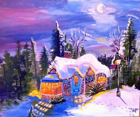 Домик яркий,прям,сказочный...А небо ,скорей,потемней должно быть...С Рождеством!Удачи!