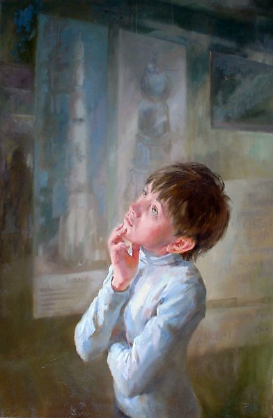 Вы очень правильно поняли мысль этой работы. На самом деле называется она в "Калужском музее космонавтики". Каждый калужанин прекрасно знает куда устремлен взгляд мальчика. Но такие огромные блестящие спутники не позволили бы сделать главной мыслью именно взгляд этого ребенка