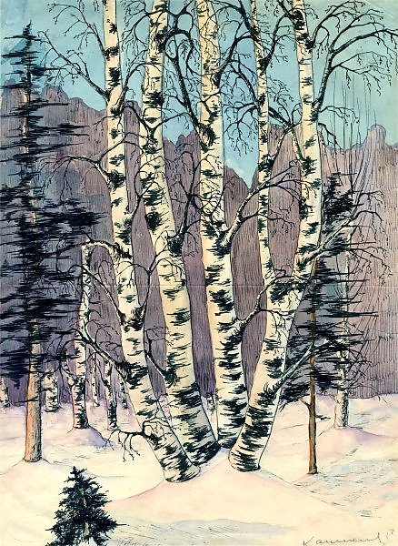 Берёзок выстроился полк, И в вышине голубоватой, Небесный вызвездился шелк ... И сердцу что-то снится, снится, Поют полозья, долго путь. А звездные дрожат ресницы, И в сумеречном поле - муть. (1914 года, Д. М. Семеновский). |