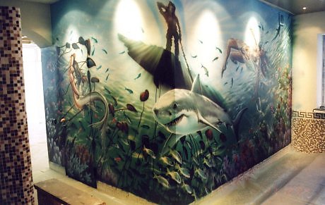 Спасибо Александр! К сожалению подсветка росписи не по моему проекту.Освещение должно быть ленточное и сточника света не должно было видно,а стены были бы освещены. Вот тогда аквариум заиграл бы как натуральный! Но клиент поставил точечное освещение и идея живого аквариума приказало долго жить.