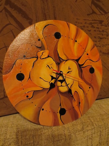 Часы настенные"Львы".Материал:акриловые краски,кисти,глянцевый лак.