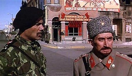 И вот, храбрые школьники «совершенно незаметно» едут по улице города на своём заметном грузовичке, и их «совершенно никто» из оккупантов не замечает. И что же парни видят? Они видят, что на всех домах вывешены советские флаги с Серпом и Молотом, все окна в домах занавешены красными плакатами с изображением Ленина», а вся улица завалена колючей проволокой, и по улицам расхаживают русские военные патрули (исключительно рядовые солдаты), которыми командует советский генерал-полковник с внешностью не то узбека, не то туркмена. Тем не мнее, храбрые парни останавливаются у магазинчика, чтобы приобрести еду. У продавщицы, когда она увидела их, вылезли глаза на лоб и он испуганно прошептала: «Вы что, спятили? Вас, как опасных партизан, разыскивает армия Кубы, армия русских и КГБ! Если вас увидят, то расстреляют на месте!»
