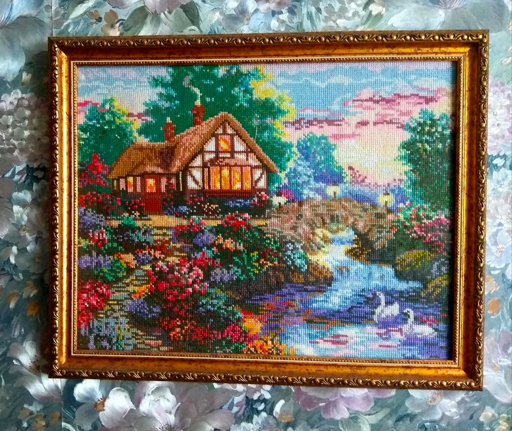 Ручная работа, вышивка пейзажа крестиком из ниток малине.