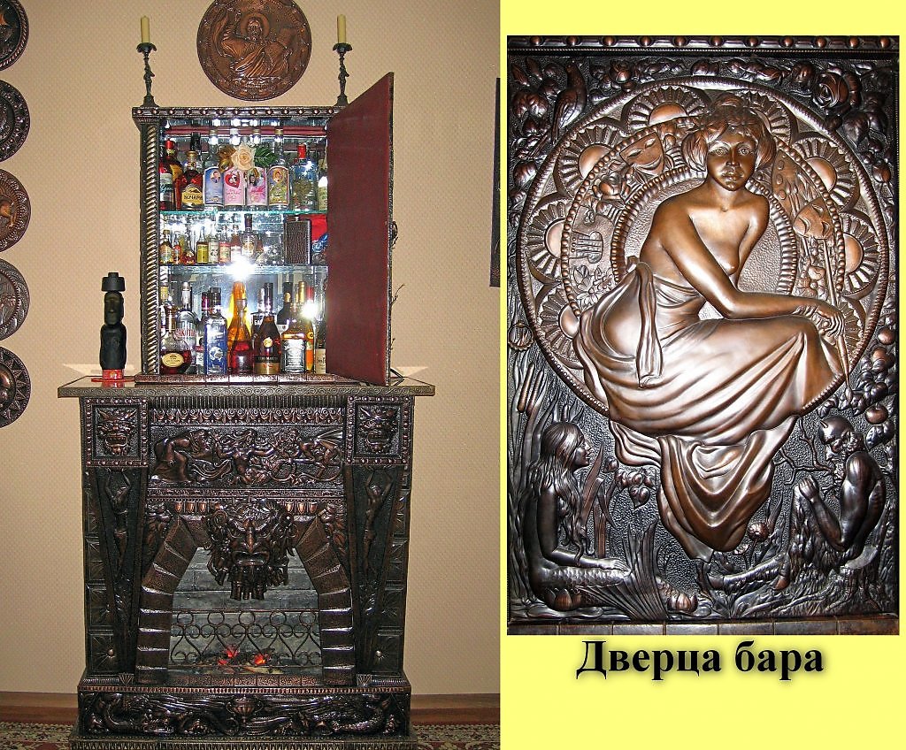 Мое хобби - чеканка по металлу. Представленная работа - камин-бар, изготовленный методом чеканки из меди, латуни и алюминия. Нижняя часть - имитация горящей топки, верхняя - бар с напитками. Высота - 2м, ширина 1,1м. Металл от 0,5 до 1мм, чернение.