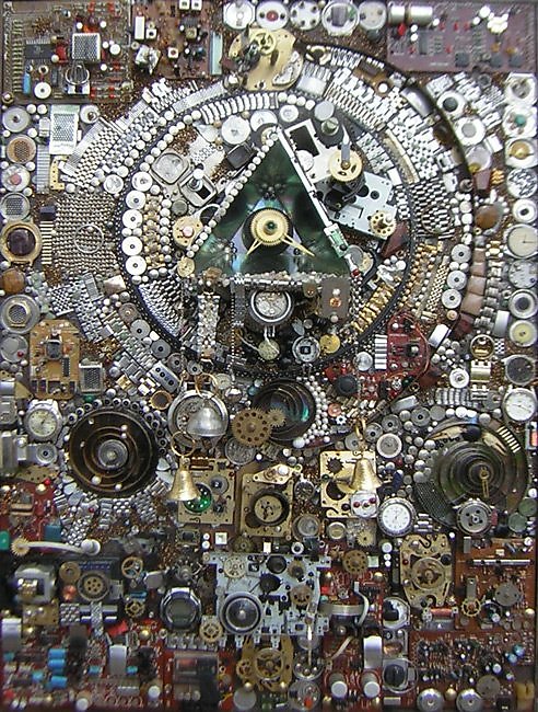 Прекрасная идея сотворить что-то из старых ненужных вещей. Насколько я увидела, материалом для творчества послужили всякие разные детальки, платы и т.д.