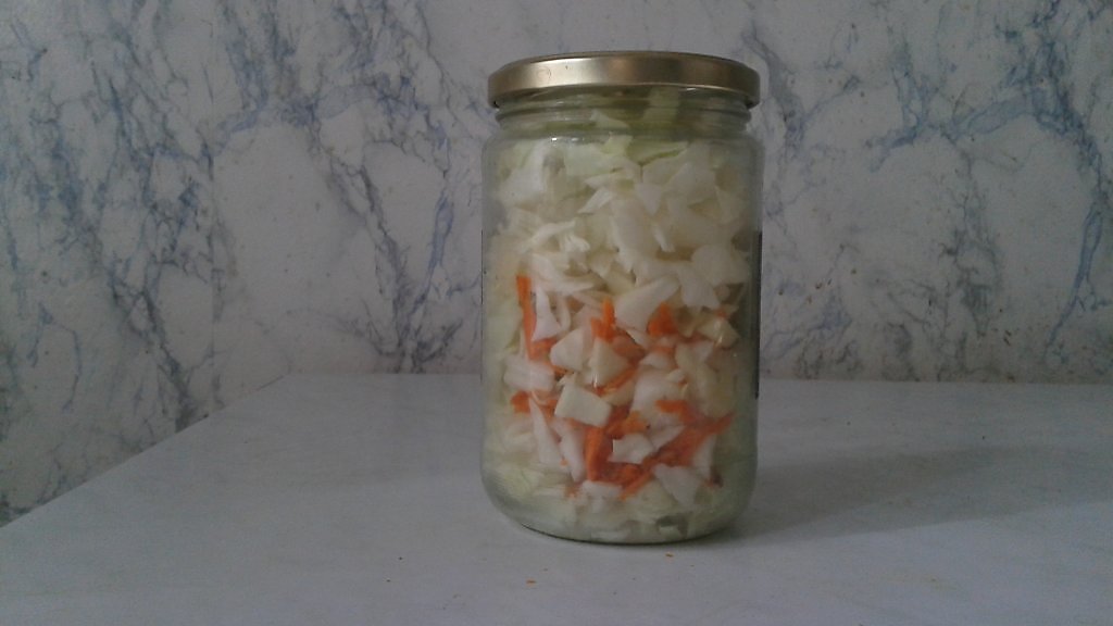 СПАСИБО! Серьезно, уже лет 45 так на зиму капусту готовим. В холодильнике 3 месяца, больше никто не выдерживает, съедает, остальные банки уже дали родственникам. Обязательно половина чайной ложки сахарного песка. Перемешать.