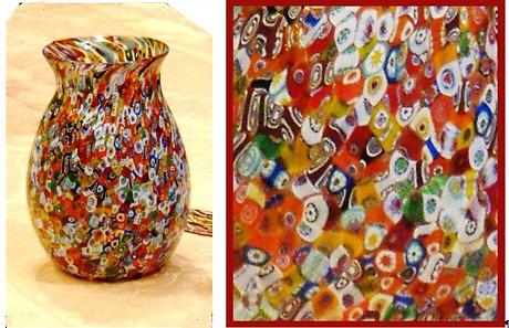 Это фрагмент фотографии кувшина из муранского стекла. Техника миллефиори (тысяча цветов): тонкие прутки слоеного разноцветного стекла, в сечении - цветочки, звезды, круги и т.п., нарезались на миллиметровые ломтики и вплавлялись в другие стеклянные формы. Сочетание цветных "деталек", а также чёткость/нечёткость линий сплавления этих "деталек" - уникально