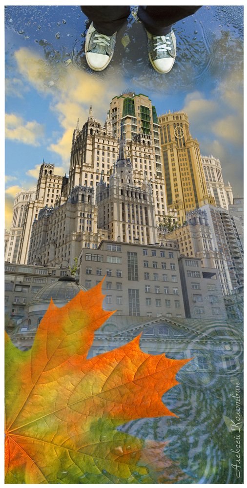 Одинокий кленовый листок на зеркальной поверхности банальной лужи. Возможно его сорвал с ветки грибной летний дождь. А легкий игривый ветерок отнес его от родного дерева прочь. И после непродолжительного свободного полета, он оказался здесь. Теперь ему остается лишь бесшумно наблюдать за бесконечным бегом прохожих…