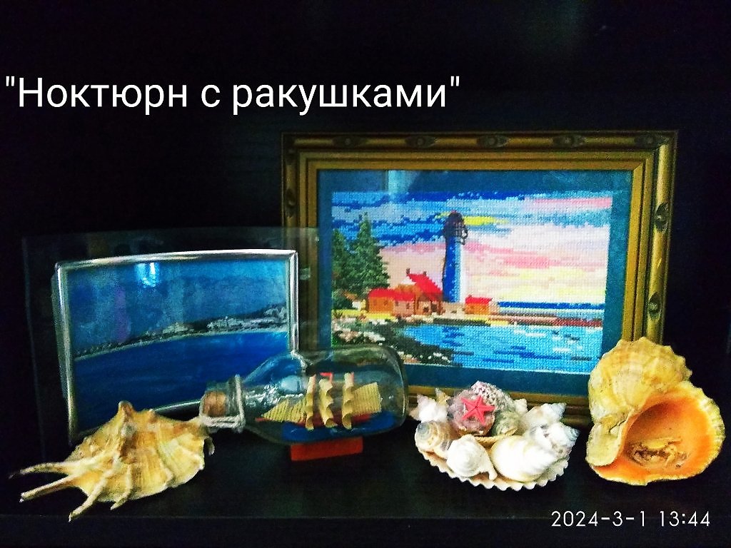 Где в фокусе ракурса фотографии видны разные виды ракушек. А так же есть небольшая картина, вышитая крестиком мною - с морским пейзажем.