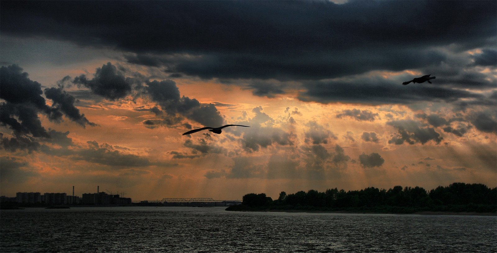Какое великолепие заката на Волге! Небо и птицы - великолепное зрелище, профессиональное фото!