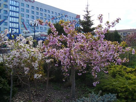 Цветущие деревья в весеннюю пору в городе Ивано - Франковске , Украина .