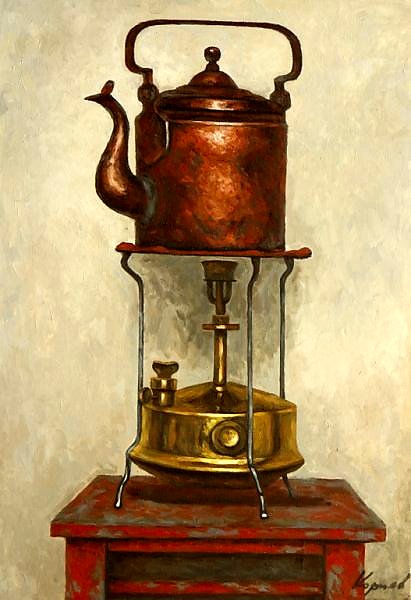 И что нам те дрова у осинок, Где стоят они дружным рядком ? Счастье все - оно есть в керосинке, Та отраду приносит в наш дом. И фасолевых щей приготовит, Как пюре сварит. Чай вскипятит. И старается даже порою Торт испечь. Чтобы был аппетит. А зимою кормила годами Всех в округе голодных котов, Когда дружно ходили кругами В домик наш, где в нем нет холодов. И весь быт от нее живописней, Даже если без листьев наш сад, Когда осенью нити повисли От дождей. Что днем, ночью шумят. Или если морозы, метели С холодами зимой настают, То она своим видом согреет Домик наш. Станет теплым уют. Если ночь. И луна позабыла В небо темное резко попасть. То тогда керосинка уныло Свет пускает. Не дав нам пропасть. Если в гости, бывало, приедут К нам друзья. С любой точки земной. То варенье все рады отведать. Запах - как у сирени весной. Керосинке "Спасибо" все нашей За варенье. Блинов напечет. Вечерами, когда варит кашу Из гречихи, то песни поет. Собирает друзей и соседей За один столик в нашем саду. И сороки спешат пообедать Тут же. Сразу, как в сад к нам придут. Если летом внезапно в массиве Свет отключат. И не скипятить Воду. То керосинка игриво Станет рада всем нам угодить. И водички для кофе согреет, Также чай и капустные щи. Быт всем делает проще, добрее. А как праздник - печет калачи. И довольны кругом от сердечной Керосинки, раз каша теплей. Да и воду для стирки, конечно, Греет. Мир от нее - веселей ! Летом, в осень, порою бывает Наступает завеса дождей. Те намочат дрова. Выручает Керосинка. Без лишних затей Согревает нам кофе отменный. В отсыревшей избе не дает Нам замерзнуть. Ведь быстро, мгновенно Та горячий обед раздает. А история у чудо-плитки Длинных лет пятьдесят пять идет. Мои близкие помнят калитку, Домик, озеро. Сад, что цветет. Месяц май. И трава зеленеет. Утки плавают в озере том. Солнце светит лучами и греет. А к обеду приехали в дом К моим близким родные их вскоре. Где сирень, то на стол там кладут Скатерть белую с пестрым узором. Собрались все к столу тут как тут. И родные на стол положили Пачку чая. Да фрукты, пирог. И воды в чайник сразу налили, А родные идут на порог Дома. Вскоре из сумки достали Керосинку. На столик кладут В доме, возле окна. Увидали Мои близкие чудо-плиту. И на радостях всех скипятили Тут же чайник на чудо-плите. Керосинка тогда угодила Всем в сноровке своей, в быстроте. И служила в ту пору как летом, Так зимой, когда в лютый мороз Придешь с поезда в дом до рассвета, Чтоб никто в момент сей не замерз. Да и печь. Защищала январским Утром. В стужу ли, в холод лихой. Ну а чудо-плита - то по-царски Все готовила суп нам с ухой. А как лето - всегда приезжали Одноклассники близких тогда. И когда на пленер выезжали На день целый. То брали всегда Краски, кисти, палитры, бумагу Чай и пару горячих котлет. Керосинка накормит ватагу Всех друзей. В ужин или в обед. Если серой осенней порою На этюды приедешь, то грусть Чудо-плитка мгновенно накроет. Даже если и дождь. Ну и пусть ! Время быстро и неумолимо Пролетает. А чудо-плита Не раз в жизни людей помирила, Нам знакомых. Везде и всегда. Зазовет и на чай с медом вкусный - Наступает за столиком лад. Варит суп керосинка искусно И любой его потчевать рад. Также варит с ромашкой экстракты, Зверобой и полынь от простуд. Чудо-плитка стараться так рада Проявить мастерство все в быту. Чай с лимоном всегда нагревала, Кипятила отвар и настой. И на дру