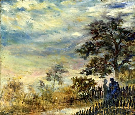 А картина (изображение) - моя, она была написана в 2003 году. По воспоминаниям о своей любви. На ней, как видно, вечер в самом начале лета. И встреча в яблоневом саду, у калитки.