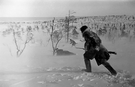 Фото - Советские пехотинцы в зимнем бою на полуострове Средний (на севере Кольского полуострова). Авторское название фото — «Перебежка». Автор к сожалению пока не установлен.