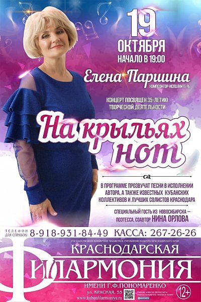 Дорогие мои друзья и поклонники, коллеги и просто знакомые, а также все те, кому ещё предстоит познакомиться с моим творчеством! Приглашаю вас на свой концерт «На крыльях нот», посвящённый 35-летию творческой деятельности! Концерт состоится 19 октября в 19:00 в красивом зале Краснодарской филармонии! Билеты можно приобрести в кассе – 8(861) 267-26-26, а также, по телефону 8(918)931-84-49
