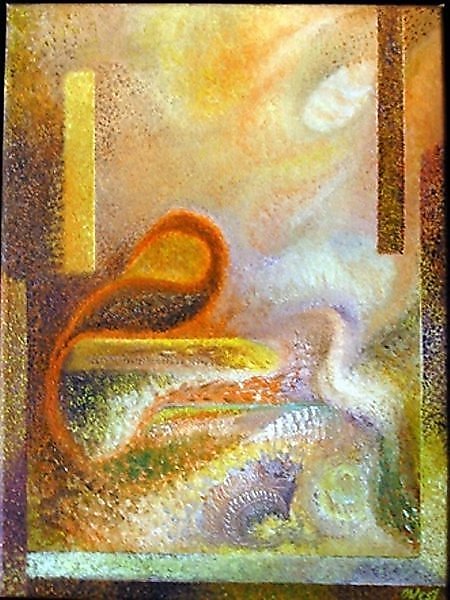 Олечка! Сидела перед твоей картиной долго- долго! пыталась, поначалу найти в ней ответ, как иллюстрацию к тексту, потом поняла, что это всё-таки твое ВРЕМЯ! Попытаюсь ее прочитать. Я увидела внизу что-то морское, время ведь это не только ночь и день, это год и месяц, это жизнь и смерть. Это ПРОЦЕСС. морская тема мне напомнила, что жизнь началась с воды, зарождая там всё живое, Над всем господствует золотой цвет- символ солнца и его энергии- животворящей. Слева темные пятна и справа -светлые, это день и ночь, Вертикальные полосы мне представляются маятником ВРЕМЕНИ. А вот что означает центральная ярко золотая композиция? сначала пыталась рассмотреть математический знак- символ бесконечности. ВРЕМЕНИ! А потом мне представилось вот что. Может это покажется...Симол мужского начала(изогнутый с хвостиком) мужской клетки на пути проникновения.. время ...зарождения новой жизни, а значит и нового времени! Как же интересно! Может у тебя все и не так вовсе, но мне показалось таким это твое ВРЕМЯ! Умная картина! Глядишь, с тобой и полюблю авангард!!!