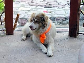 Пока еще я его кормила, он хорошо дрессировался, стал выполнять команды, наслаждался персональным ковриком на веранде и дал даже себя выкупать.Я его в шутку называла бригадиром и повязала ему оранжевую бандану за компанию со строителями.