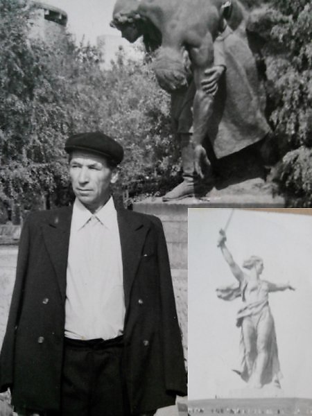 На фотоколлаже мой дедушка, Андреев Григорий Егорович, в городе-герое Волгограде возле памятников «Героям Сталинградской битвы» на Мамаевом кургане, около 1980 года.