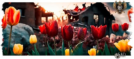 Визуальным воплощением этой идеи служит приложенное изображение. На переднем плане — яркие, полные жизни тюльпаны, их лепестки усыпаны каплями, словно слезами или утренней росой. Они — символ неугасимой красоты, стойкости и новой жизни. А за ними, в расфокусе, — страшная реальность: разрушенные, почерневшие дома, закатное или рассветное солнце, пробивающееся сквозь дым и гарь. Этот контраст — кричащий. Картина не дает забыть о цене, которую платит земля, но тюльпаны на переднем плане утверждают: жизнь победит. Они — те самые «цветочные повязки», о которых поет автор.
