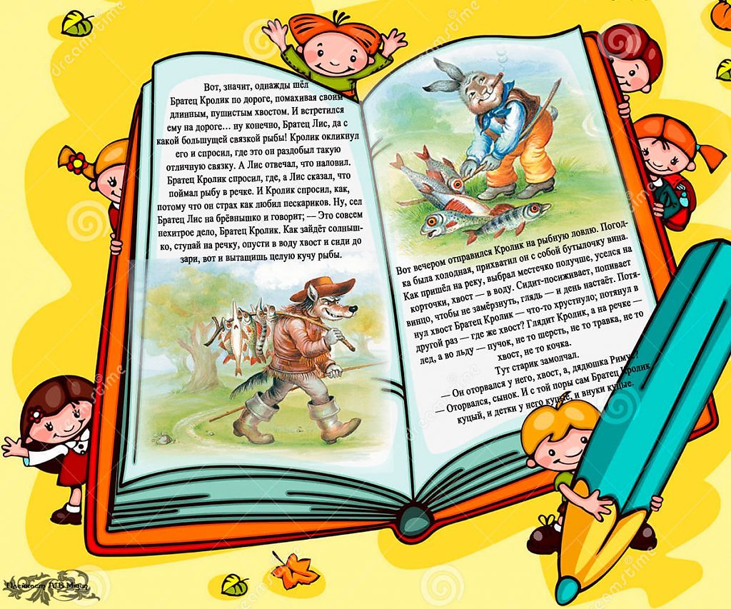 Братец Кролик спросил, где, а Лис сказал, что поймал рыбу в речке. И Кролик спросил, как, потому что он страх как любил пескариков. Ну, сел Братец Лиc на брёвнышко и говорит; — Это совсем нехитрое дело, Братец Кролик. Как зайдёт солнышко, ступай на речку, опусти в воду хвост и сиди до зари, вот и вытащишь целую кучу рыбы.
