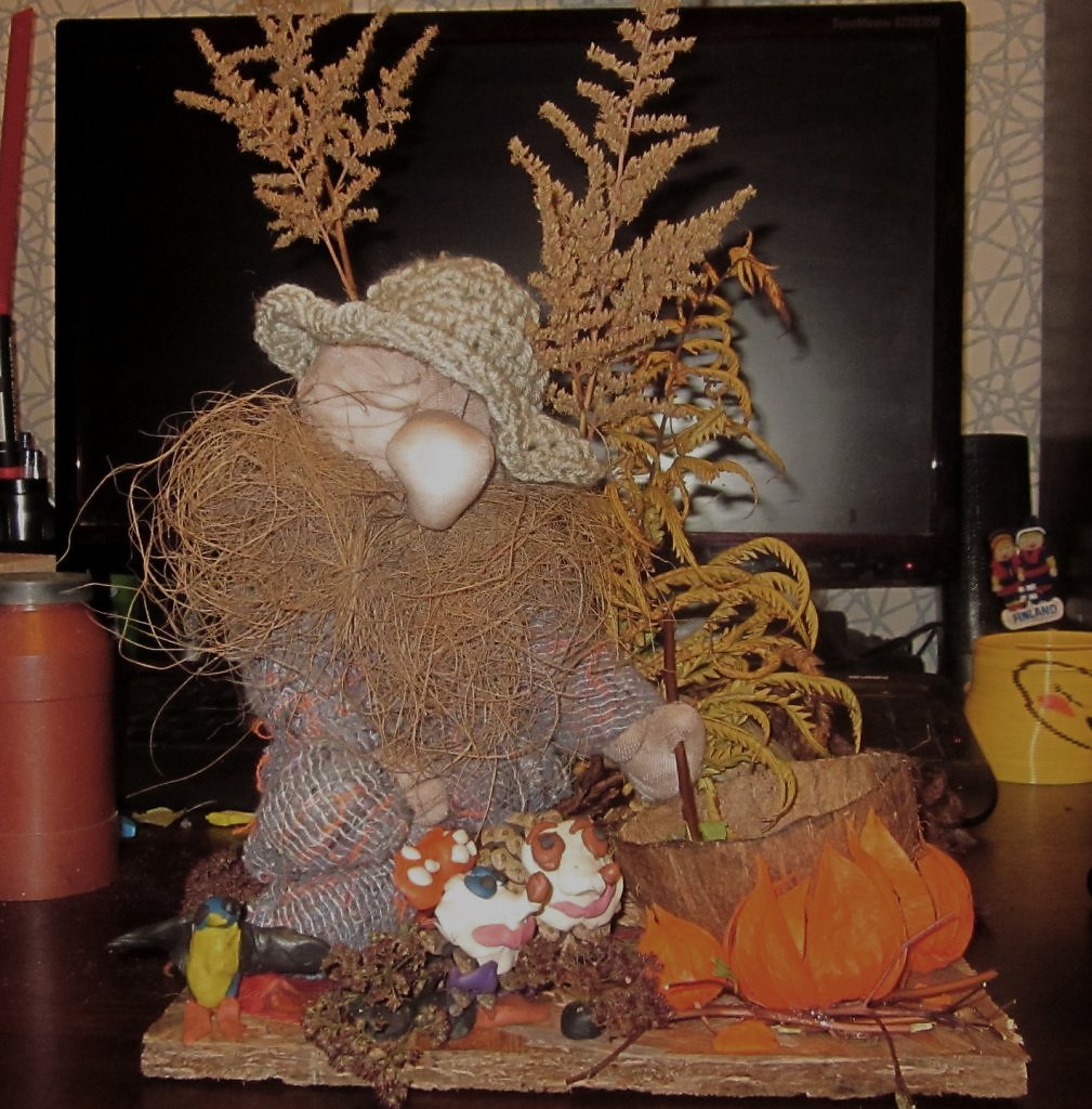 Грустный и носатый сделан из старого капронового носка, ветоши для стирания пыли, синтепона и бечевки, борода из мочала. Костер сделан из физалиса, котел из половинки кокоса, друзья-ежи грустного и носатого - из пластилина и шишек.